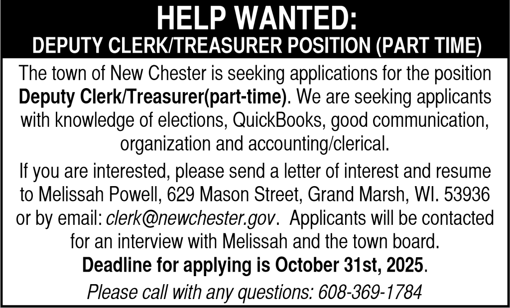 Posted on October 14, 2025, Edited October 14, 2025 by Dado Deputy Clerk/Treasurer Position (Part Time)